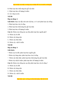 Giải thích: D a vào đ ự ặc tính sinh v t ậ h c, có 3 cách ọ phân lo i ạ cây tr ng: ồ 1. Phân lo i ạ theo chu kì s ng ố 2. Phân lo i ạ theo kh năng hóa ả g c ỗ a ủ thân 3. Phân lo i ạ theo s l ố ư ng l ợ á m m ầ Câu 11. D a ự vào đ c ặ tính sinh v t ậ h c, ọ có cách phân lo i ạ cây tr ng nào? ồ A. Phân lo i ạ theo chu kì s ng ố M i