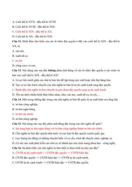 Câu 12. Hình thức tiêu biểu của các tổ chức độc quyền ở Mỹ vào cuối thế kỉ XIX - đầu thế kỉ XX, là A. các-ten. B. xanh-đi-ca. C. tơ-rớt. D. công-xooc-xi-om.