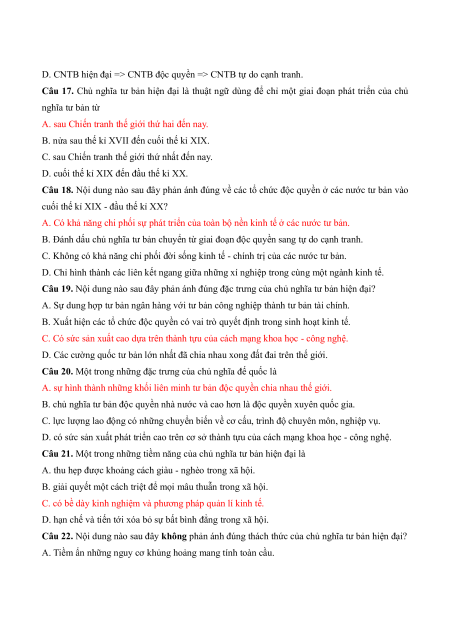 Câu 17. Chủ nghĩa tư bản hiện đại là thuật ngữ dùng để chỉ một giai đoạn phát triển của chủ nghĩa tư bản từ