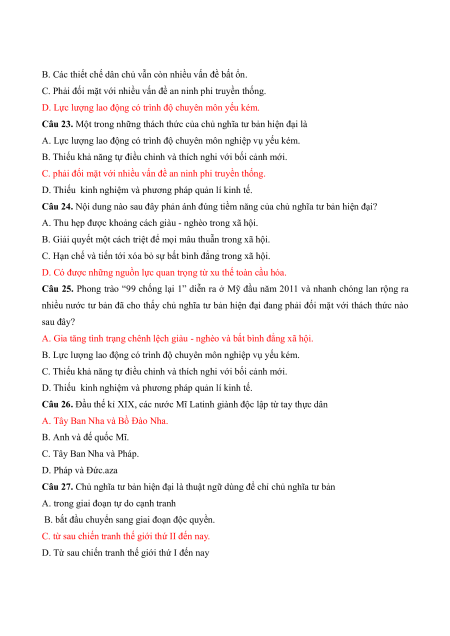 Câu 22. Nội dung nào sau đây không phản ánh đúng thách thức của chủ nghĩa tư bản hiện đại?
