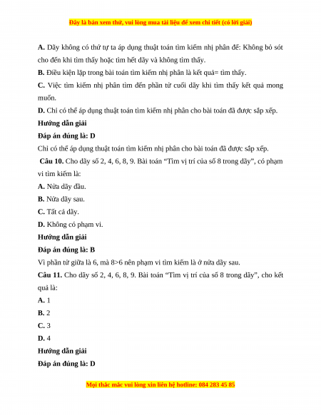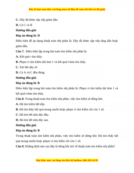 Câu 9. Khẳng định nào sau đây là đúng khi nói về thuật toán tìm kiếm nhị phân?