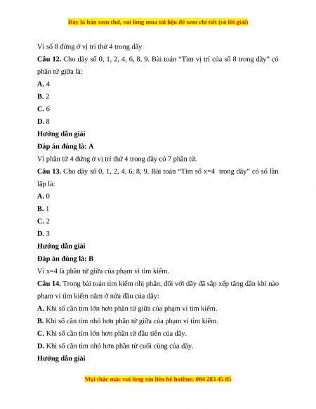 Câu 11. Cho dãy số 2, 4, 6, 8, 9. Bài toán “Tìm vị trí của số 8 trong dãy”, cho kết quả là: A. 1 B. 2 C. 3 D. 4 Hướng dẫn giải