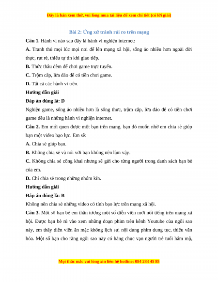 Trắc nghiệm Bài 2: Ứng xử tránh rủi ro trên mạng
