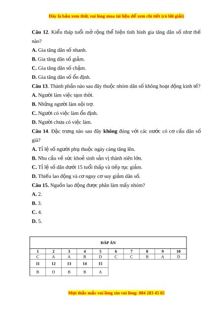 Câu 15. Nguồn lao đ ng đ ộ ư c phân ợ làm m y nhóm ấ ? A. 2. B. 3. C. 4. D. 5. ĐÁP ÁN 1 2 3 4 5 6 7 8 9 10 C A A B D C C B A D 11 12 13 14 15 B D B B A M i