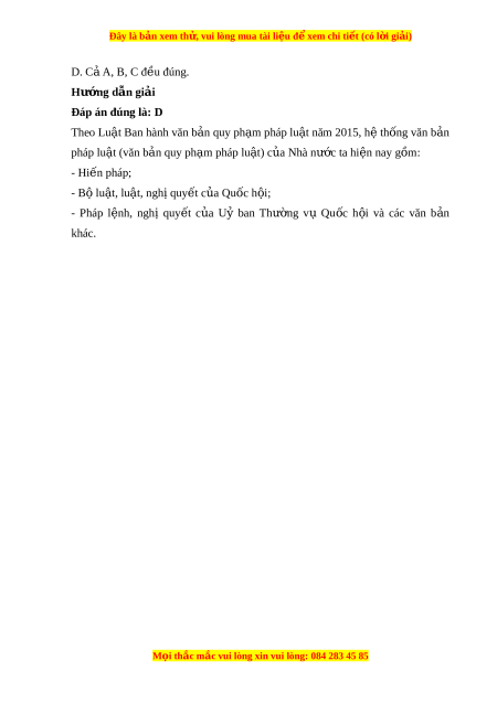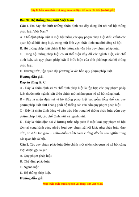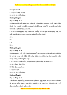 Đây là bản xem th , vu ử i lòng mua tài li u ệ đ xe ể m chi ti t ế (có l i ờ gi i ả ) B. Lu t ậ Dân s . ự C. Lu t ậ Tố t ng dân s ụ . ự D. Cả A, B, C đ u đúng. ề Hư ng ớ d n gi ẫ i ả Đáp án đúng là: D Hệ thống pháp lu t ậ Vi t ệ Nam g m ồ các ngành lu t ậ chính sau: Lu t ậ Hi n ế pháp (Lu t ậ Nhà nư c) ớ , Lu t ậ Hành chính, Lu t ậ Dân s , ự Lu t ậ Tố t ng ụ dân s , ự Lu t ậ Hình s , L ự u t ậ Tố t ng hì ụ nh s ,... ự