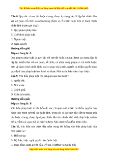 hành theo trình tự thủ t c ụ lu t ậ đ nh, ị trong đó có các quy t c ắ xử sự mang tính b t ắ bu c ộ chung, đư c ợ áp d ng ụ nhi u ề l n ầ cho nhi u ề chủ th ể pháp lu t ậ , nh m ằ đi u ch ề ỉnh các quan hệ xã h i ộ và đư c ợ Nhà nư c ớ b o đ ả m ả th c hi ự n. ệ Câu 10. Văn b n ả nào dư i ớ đây n m ằ trong hệ th ng ố văn b n ả pháp lu t ậ c a ủ Nhà nư c t ớ a? A. Hi n ế pháp. B. B l ộ u t ậ , lu t ậ , ngh quy ị t ế c a Q ủ u c h ố i ộ . C. Pháp l nh, ngh ệ quy ị t ế c a ủ U ban ỷ Thư ng ờ v Q ụ u c ố h i ộ . M i ọ thắc m c