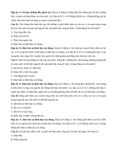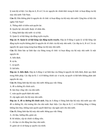 Câu 13. Đảm bảo sự lãnh đạo của Đảng trong tổ chức và hoạt động của bộ máy nhà nước là một nguyên tắc A. hiến định. B. tự do. C. tự quyết. D. bất biến.