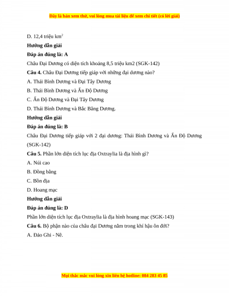 Câu 3. Châu Đại Dương có diện tích khoảng A. 8,5 triệu km2 B. 7,7 triệu km2 C. 10 triệu km2