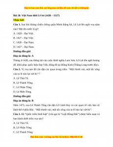 Câu 1. Sau khi kháng chiến chống quân Minh thắng lợi, Lê Lợi lên ngôi vua năm