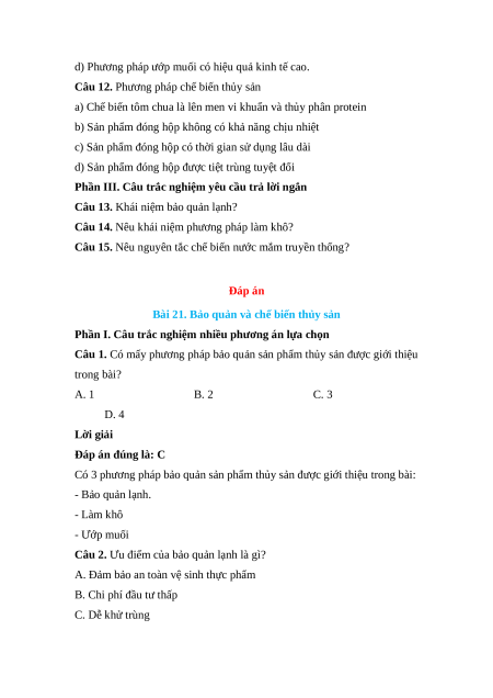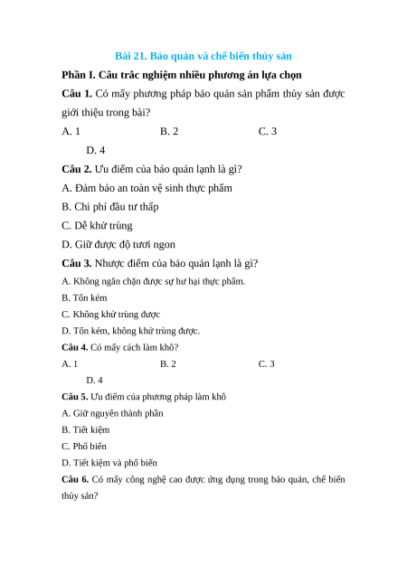 Câu 1. Có mấy phương pháp bảo quản sản phẩm thủy sản được giới thiệu trong bài? A. 1 B. 2 C. 3 D. 4