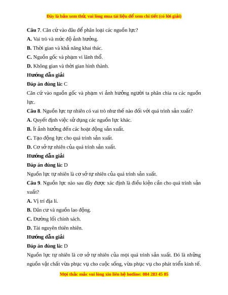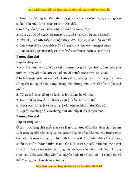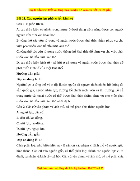 Đây là bản xem th , vu ử i lòng mua tài li u ệ đ xe ể m chi ti t (c ế ó l i ờ gi i ả ) Bài 21. Các ngu n l ồ c ự phát tri n ki ể nh tế Câu 1. Nguồn l c l ự à A. các đi u ề ki n ệ tự nhiên trong nư c ớ ở dư i ớ d ng ạ ti m ề năng đư c ợ con ngư i ờ nghiên c u ứ đ a vào khai ư thác.