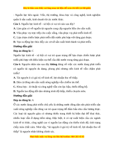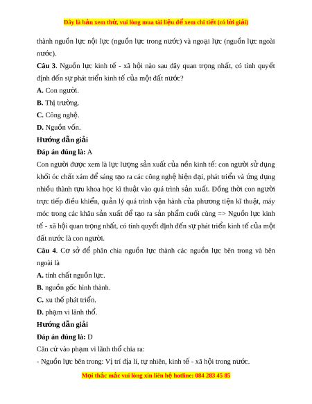 Đây là bản xem th , vu ử i lòng mua tài li u ệ đ xe ể m chi ti t (c ế ó l i ờ gi i ả ) thành nguồn l c ự n i ộ l c ự (ngu n ồ l c ự trong nư c) ớ và ngo i ạ l c ự (ngu n ồ l c ự ngoài nư c) ớ . Câu 3. Ngu n ồ l c ự kinh tế - xã h i ộ nào sau đây quan tr ng ọ nh t ấ , có tính quy t ế định đ n s ế ự phát tri n ể kinh tế c a m ủ t ộ đ t ấ nư c? ớ A. Con ngư i ờ . B. Thị trư ng. ờ C. Công ngh . ệ D. Nguồn vốn. Hư ng d ớ ẫn gi i ả Đáp án đúng là: A Con ngư i ờ đư c ợ xem là l c ự lư ng ợ s n ả xu t ấ c a ủ n n ki ề nh t : ế con ngư i ờ s ử d ng ụ khối óc ch t ấ xám để sáng t o ạ ra các công ngh ệ hi n ệ đ i ạ , phát tri n ể và ng ứ d ng ụ nhi u ề thành t u ự khoa h c ọ kĩ thu t ậ vào quá trình s n ả xu t ấ . Đ ng ồ th i ờ con ngư i ờ tr c ự ti p ế đi u ề khi n, ể qu n ả lý quá trình v n ậ hành c a ủ phư ng ơ ti n ệ kĩ thu t ậ , máy móc trong các khâu s n ả xu t ấ để t o ạ ra s n ả ph m ẩ cu i ố cùng => Ngu n ồ l c ự kinh tế - xã h i ộ quan tr ng ọ nh t ấ , có tính quy t ế đ nh ị đ n ế s ự phát tri n ể kinh t c ế a ủ m t ộ đất nư c ớ là con ngư i ờ .