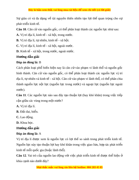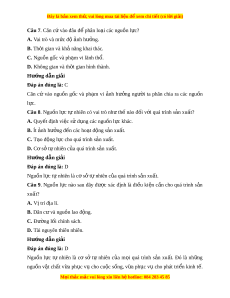 ờ ta phân chia ra các ngu n ồ l c. ự Câu 8. Nguồn l c t ự nhi ự ên có vai trò nh t ư h nào ế đ i ố v i ớ quá trình s n ả xu t ấ ? A. Quy t ế đ nh vi ị c s ệ ử d ng các ngu ụ ồn l c khác. ự B. Ít nh ả hư ng đ ở n các ế ho t ạ đ ng ộ s n ả xu t ấ . C. T o đ ạ ng ộ l c cho quá t ự rình s n ả xu t ấ . D. Cơ sở t nhi ự ên c a quá ủ trình s n ả xu t ấ . Hư ng d ớ ẫn gi i ả Đáp án đúng là: D Nguồn l c t ự nhi ự ên là c s ơ ở t nhi ự ên c a quá ủ trình s n ả xu t ấ . Câu 9. Ngu n ồ l c ự nào sau đây đư c ợ xác đ nh ị là đi u ề ki n ệ c n ầ cho quá trình s n ả xuất? A. Vị trí đ a l ị í. B. Dân c và ư nguồn lao đ ng. ộ C. Đư ng ờ lối chính sách.