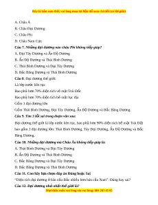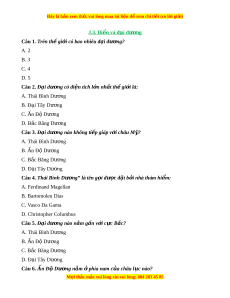 hi không ti p gi ế áp? A. Đ i ạ Tây Dư ng và ơ n Đ Ấ D ộ ư ng ơ B. n Đ Ấ D ộ ư ng ơ và Thái Bình Dư ng ơ C. Thái Bình Dư ng và Đ ơ i ạ Tây Dư ng ơ D. B c B ắ ăng Dư ng và ơ Thái Bình Dư ng ơ Câu 8. Đ i ạ dư ng t ơ h gi ế i ớ : Là l p n ớ ư c ớ liên t c ụ Bao ph h ủ n 70% ơ di n t ệ ích v m ề t ặ Trái Đ t ấ Bao ph h ủ n 70% ơ di n t ệ ích b m ề t ặ l c đ ụ a ị Gồm 3 đ i ạ dư ng ơ l n ớ Gồm Thái Bình Dư ng, ơ Đ i ạ Tây Dư ng, ơ n Đ Ấ D ộ ư ng ơ và B c B ắ ăng Dư ng. ơ