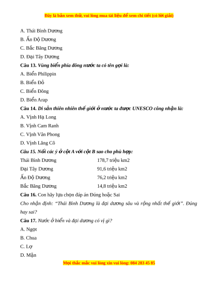 Câu 16. Con hãy l a ch ự n ọ đáp án Đúng ho c ặ Sai Cho nh n ậ đ nh: ị “Thái Bình Dư ng ơ là đ i ạ dư ng ơ sâu và r ng ộ nh t ấ thế gi i ớ ”. Đúng hay sai? Câu 17. Nư c ớ ở bi n ể và đ i ạ dư ng ơ có v gì ị ? A. Ng t ọ B. Chua C. Lợ D. M n ặ M i ọ thắc m c