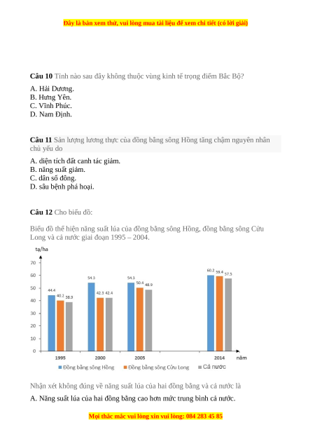 Câu 11 Sản lượng lương thực của đồng bằng sông Hồng tăng chậm nguyên nhân chủ yếu do