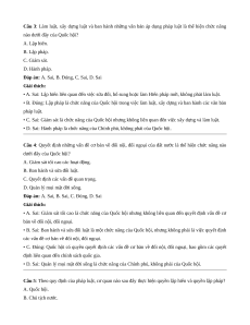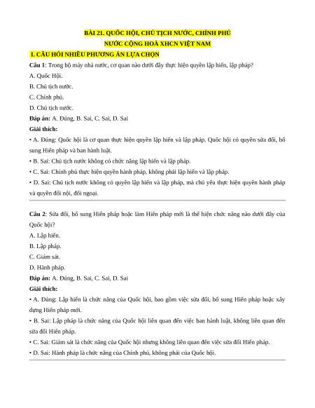 Câu 1: Trong bộ máy nhà nước, cơ quan nào dưới đây thực hiện quyền lập hiến, lập pháp? A. Quốc Hội. B. Chủ tịch nước. C. Chính phủ. D. Chủ tịch nước.