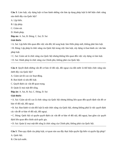 • C. Sai: Giám sát là chức năng của Quốc hội nhưng không liên quan đến việc xây dựng và làm luật.