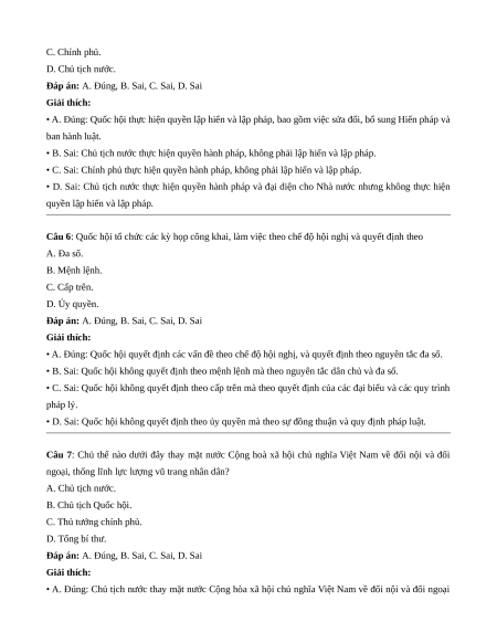 • B. Sai: Quốc hội không quyết định theo mệnh lệnh mà theo nguyên tắc dân chủ và đa số.