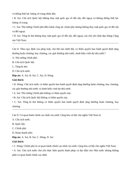 • B. Sai: Chủ tịch nước thực hiện quyền hành pháp, không phải lập hiến và lập pháp.