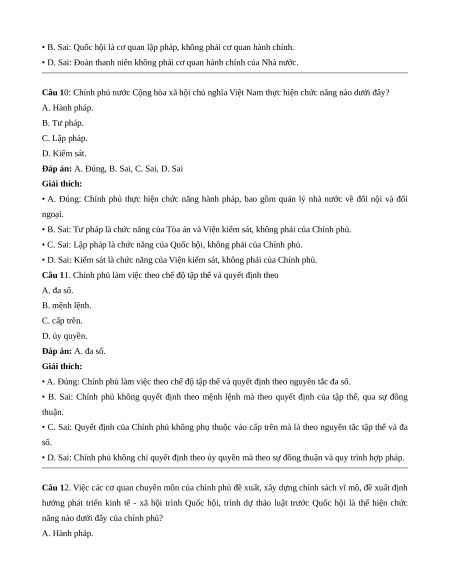 • C. Sai: Chính phủ thực hiện quyền hành pháp, không phải lập hiến và lập pháp.