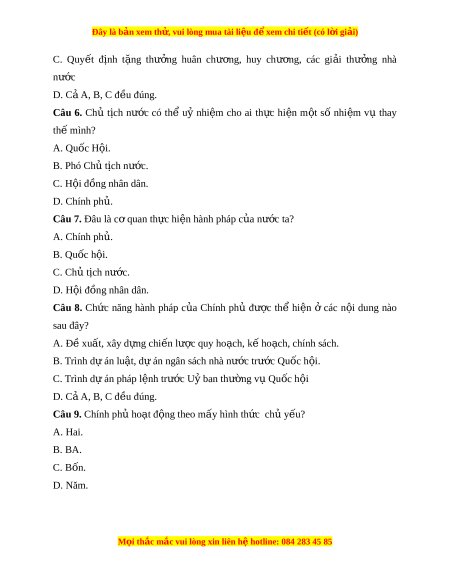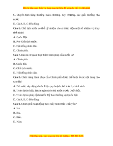 Câu 8. Chức năng hành pháp c a ủ Chính phủ đư c ợ thể hi n ệ ở các n i ộ dung nào sau đây? A. Đề xuất, xây d ng ự chi n l ế ư c quy ho ợ ạch, k ho ế ch, ạ chính sách. B. Trình d án ự lu t ậ , d án ngân s ự ách nhà nước trư c Q ớ uốc h i ộ . C. Trình d án ự pháp l nh t ệ rư c ớ U ban t ỷ hư ng v ờ Q ụ u c h ố i ộ D. C ả A, B, C đ u ề đúng. Câu 9. Chính ph ho ủ t ạ đ ng t ộ heo m y hì ấ nh th c ch ứ ủ y u? ế A. Hai. B. BA. C. Bốn. D. Năm. M i