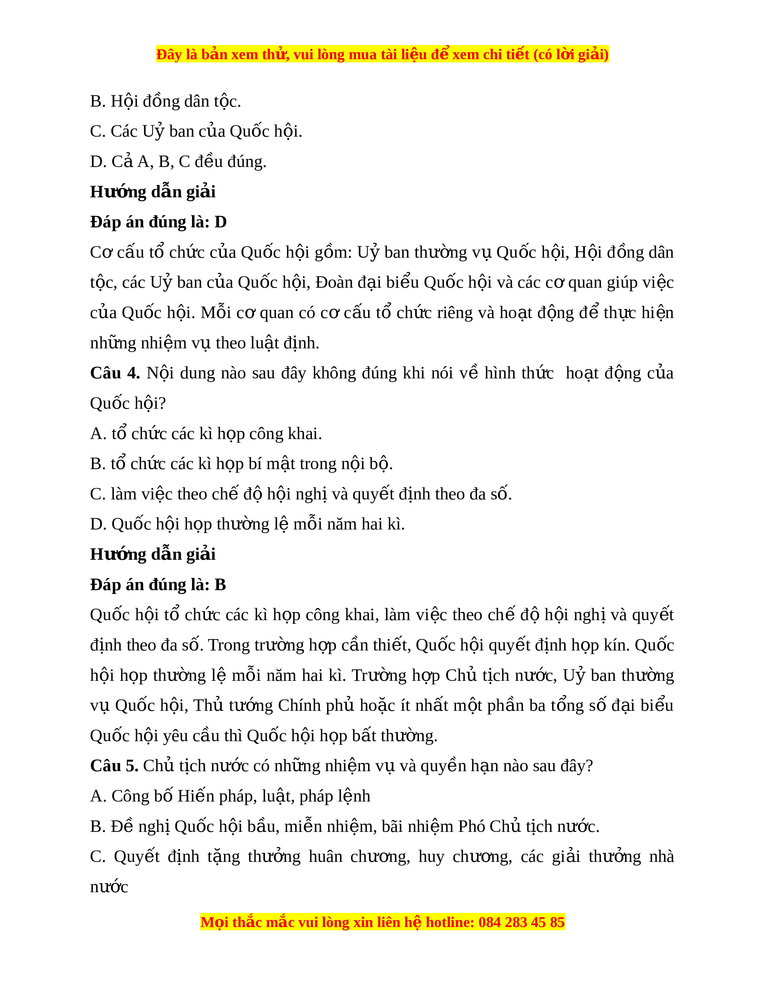 Đây là bản xem th , vu ử i lòng mua tài li u ệ đ xe ể m chi ti t (c ế ó l i ờ gi i ả ) B. H i ộ đ ng dân t ồ c. ộ C. Các Uỷ ban c a Q ủ uốc h i ộ . D. C ả A, B, C đ u ề đúng. Hư ng d ớ ẫn gi i ả Đáp án đúng là: D Cơ cấu tổ ch c ứ c a ủ Qu c ố h i ộ g m ồ : U ỷ ban thư ng ờ v ụ Qu c ố h i ộ , H i ộ đ ng ồ dân t c, ộ các Uỷ ban c a ủ Qu c ố h i ộ , Đoàn đ i ạ bi u ể Qu c ố h i ộ và các c ơ quan giúp vi c ệ c a ủ Qu c ố h i ộ . M i ỗ cơ quan có c ơ c u ấ t ổ ch c ứ riêng và ho t ạ đ ng ộ đ ể th c ự hi n ệ nh ng nhi ữ ệm v t ụ heo lu t ậ đ nh. ị Câu 4. N i
