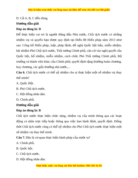 Đây là bản xem th , vu ử i lòng mua tài li u ệ đ xe ể m chi ti t (c ế ó l i ờ gi i ả ) D. C ả A, B, C đ u ề đúng. Hư ng d ớ ẫn gi i ả Đáp án đúng là: D Để th c ự hi n ệ vai trò là ngư i ờ đ ng ứ đ u ầ Nhà nư c, ớ Chủ t ch ị nư c ớ có nh ng ữ nhiệm vụ và quy n ề h n ạ đư c ợ quy đ nh ị t i ạ Đi u ề 88 Hi n ế pháp năm 2013 như sau: Công bố Hi n ế pháp, lu t ậ , pháp l nh ệ ; đề nghị Qu c ố h i ộ b u, ầ mi n ễ nhi m ệ , bãi nhi m ệ Phó Ch ủ t ch ị nư c, ớ Th ủ tư ng ớ Chính ph , ủ căn c ứ vào ngh ịquy t ế c a ủ Quốc h i ộ , bổ nhi m ệ , mi n ễ nhi m ệ , cách ch c ứ Phó Thủ tư ng ớ Chính ph , ủ Bộ trư ng ở và thành viên khác c a ủ Chính ph ; ủ quy t ế đ nh ị t ng ặ thư ng ở huân chư ng, ơ huy chư ng, ơ các gi i ả thư ng nhà n ở ư c,... ớ