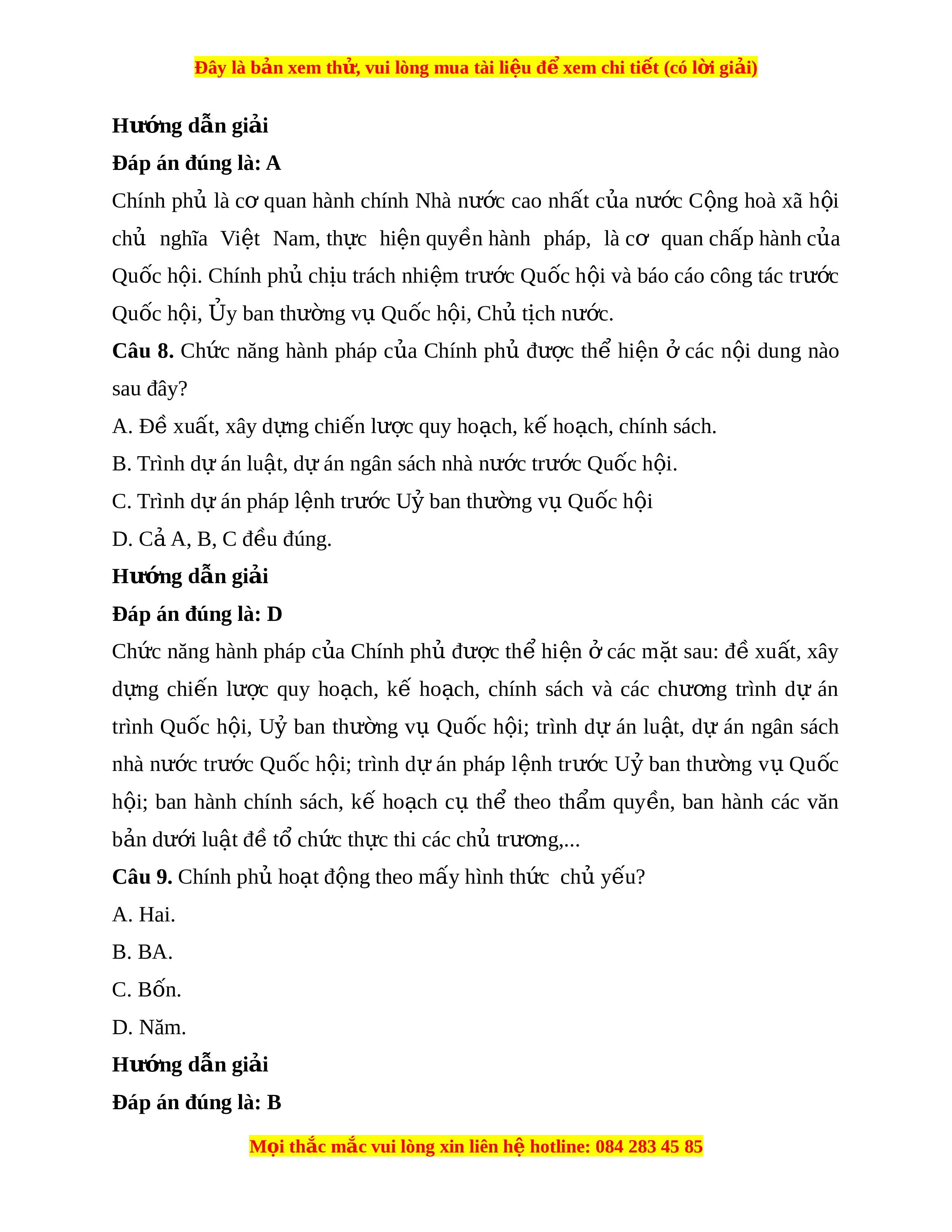 ộ ; ban hành chính sách, kế ho ch ạ cụ thể theo th m ẩ quy n, ề ban hành các văn b n ả dư i ớ lu t ậ đề t ch ổ c ứ th c t ự hi các chủ trư ng,... ơ Câu 9. Chính ph ho ủ t ạ đ ng t ộ heo m y hì ấ nh th c ch ứ ủ y u? ế A. Hai. B. BA. C. Bốn. D. Năm. Hư ng d ớ ẫn gi i ả Đáp án đúng là: B M i