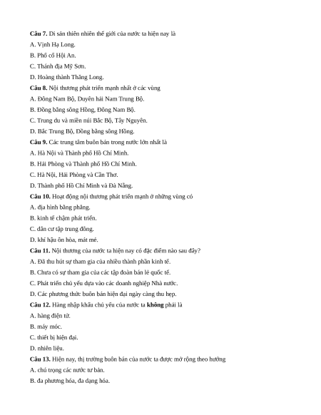 Câu 11. Nội thương của nước ta hiện nay có đặc điểm nào sau đây?