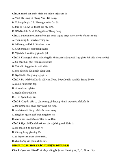 Câu 21. Sự phân hóa lãnh thổ du lịch nước ta phụ thuộc vào các yếu tố nào sau đây?