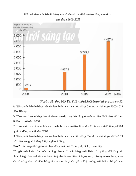 Câu 12. Hàng nhập khẩu chủ yếu của nước ta không phải là A. hàng điện tử. B. máy móc. C. thiết bị hiện đại. D. nhiên liệu.
