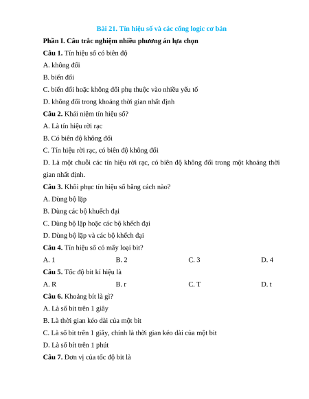 Câu 1. Tín hiệu số có biên độ A. không đổi B. biến đổi