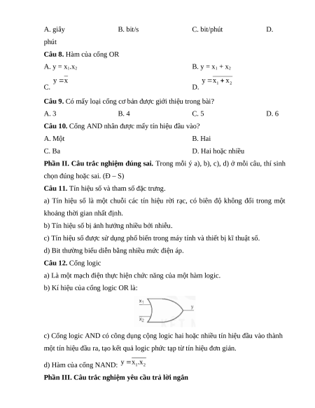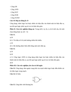 Câu 10. Cổng AND nhân được mấy tín hiệu đầu vào? A. Một B. Hai C. Ba D. Hai hoặc nhiều
