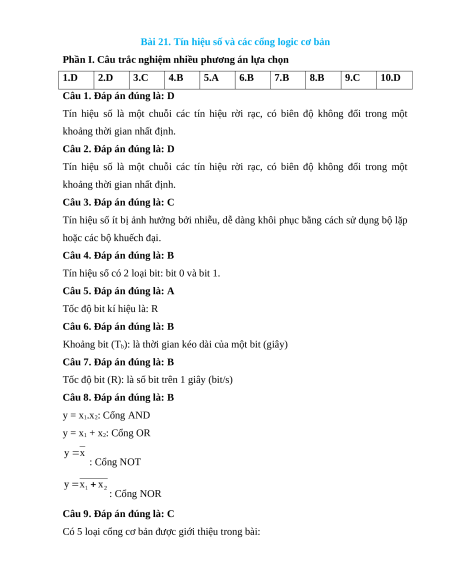 Phần I. Câu trắc nghiệm nhiều phương án lựa chọn 1.D 2.D 3.C 4.B 5.A 6.B 7.B 8.B 9.C 10.D