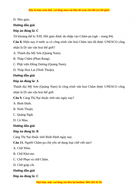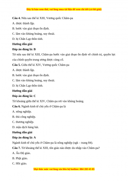 Câu 7. Từ khoảng thế kỉ XIII, tôn giáo nào được du nhập vào Chăm-pa? A. Ấn Độ giáo. B. Phật giáo. C. Hồi giáo.