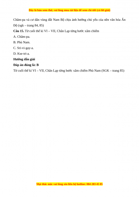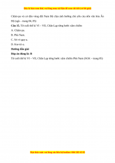 Câu 13. Vùng đất Thủy Chân Lạp chủ yếu thuộc khu vực nào của Việt Nam hiện nay? A. Nam Bộ. B. Bắc Bộ. C. Trung Bộ. D. Tây Nguyên. Hướng dẫn giải Đáp án đúng là: A