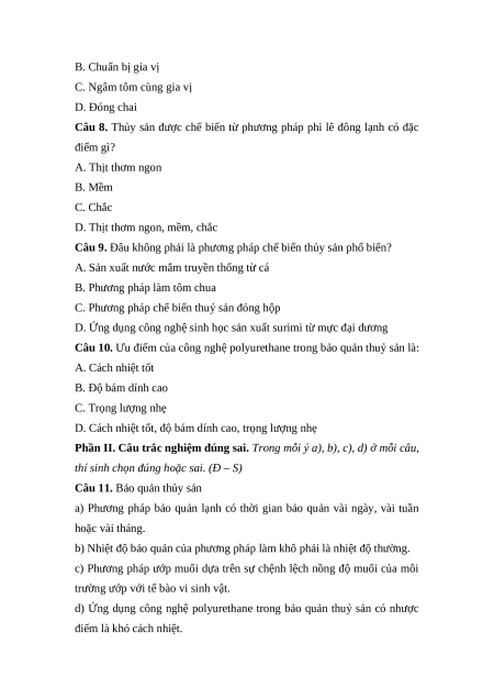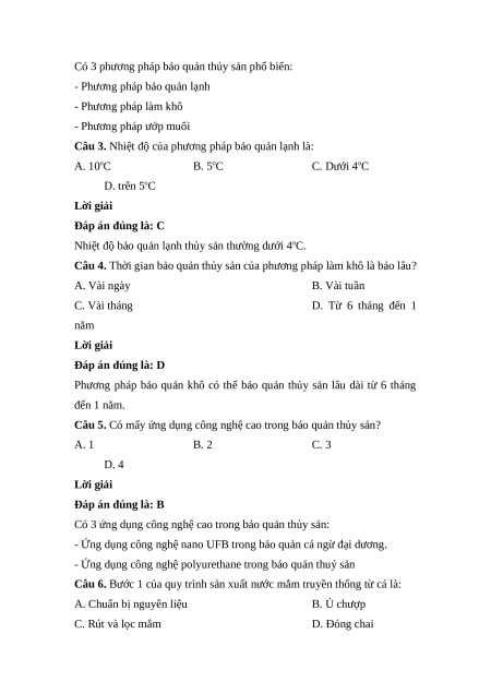 Câu 4. Thời gian bảo quản thủy sản của phương pháp làm khô là bảo lâu? A. Vài ngày B. Vài tuần C. Vài tháng D. Từ 6 tháng đến 1 năm