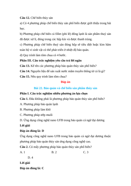 Câu 2. Có mấy phương pháp bảo quản thủy sản phổ biến? A. 1 B. 2 C. 3 D. 4 Lời giải Đáp án đúng là: C
