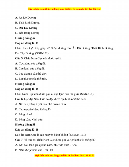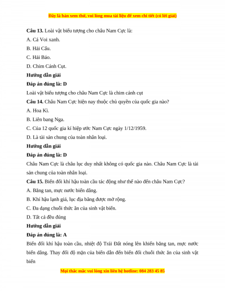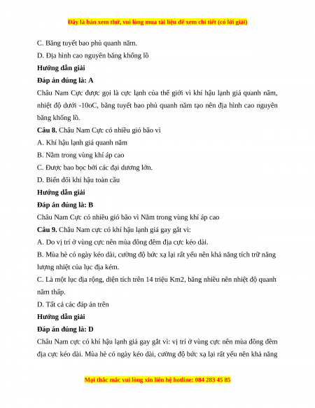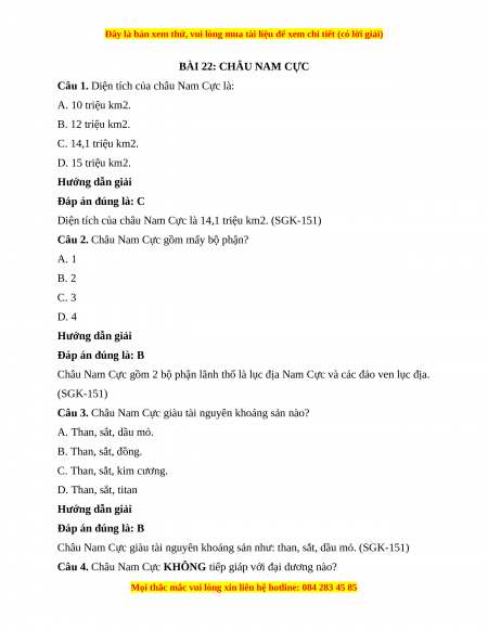 Câu 1. Diện tích của châu Nam Cực là: A. 10 triệu km2. B. 12 triệu km2. C. 14,1 triệu km2. D. 15 triệu km2. Hướng dẫn giải Đáp án đúng là: C