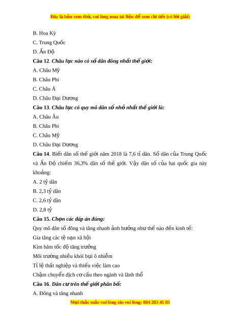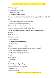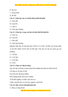 Câu 13. Châu l c có quy m ụ ô dân s n ố h n ỏ h t ấ th gi ế i ớ là: A. Châu Âu B. Châu Phi C. Châu Mỹ D. Châu Đ i ạ Dư ng ơ Câu 14. Bi t ế dân số thế gi i