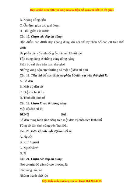 Câu 18. Tiêu chí đ xác đ ể nh s ị phân b ự dân c ố t ư rên th gi ế i ớ là: A. Số dân B. M t ậ đ dân ộ số C. Di n t ệ ích c t ư rú D. Trình độ kinh tế Câu 19. Ch n X ọ vào ô tư ng ơ ng: ứ M t ậ đ dân s ộ ố là: ĐÚNG SAI