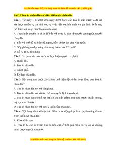Câu 2. Cơ quan nào c a ủ nư c t ớ a th c ự hi n quy ệ n ề t pháp? ư A. Quốc h i ộ . B. Tòa án nhân dân. C. Chính ph . ủ D. y ban Ủ nhân dân. Câu 3. N i ộ dung nào dư i ớ đây không thể hi n ệ đ c ặ đi m ể ho t ạ đ ng ộ c a ủ Tòa án nhân dân?