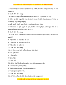 Câu 6. Hệ thống Vi n ệ ki m ể sát nhân dân Vi t ệ Nam bao g m ồ nh ng ữ c ơ quan nào sau đây? A. Viện ki m ể sát nhân dân tối cao. B. Vi n ki ệ m ể sát nhân dân c p t ấ nh. ỉ C. Vi n ki ệ m ể sát quân s . ự D. C ả A, B, C đ u ề đúng. Câu 7. T t ấ c các ả Vi n k ệ i m ể sát do ai lãnh đ o? ạ A. Chủ tịch nư c. ớ B. Vi n t ệ rư ng. ở C. Quốc h i ộ . D. Chính ph . ủ