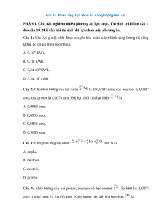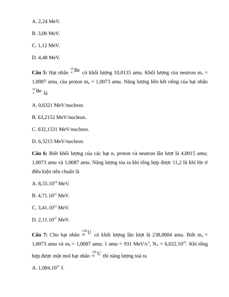 Câu 6: Biết khối lượng của các hạt α, proton và neutron lần lượt là 4,0015 amu;