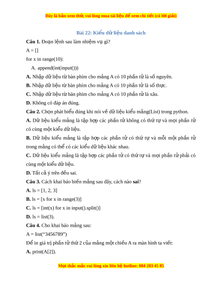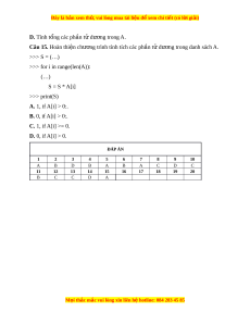 Đây là bản xem th , vu ử i lòng mua tài li u ệ đ xe ể m chi ti t (c ế ó l i ờ gi i ả ) Bài 22: Ki u d ể l ữ i u danh s ệ ách Câu 1. Đo n ạ l nh s ệ au làm nhi m ệ v gì ụ ? A = [] for x in range(10): A. append(int(input())) A. Nh p ậ d l ữ i u t ệ bàn phí ừ m cho m ng ả A có 10 ph n t ầ l ử à s nguyên. ố B. Nh p d ậ ữ li u t ệ bàn phí ừ m cho m ng ả A có 10 ph n t ầ ử là s t ố h c. ự C. Nh p ậ d l ữ i u t ệ bàn phí ừ m cho m ng ả A có 10 ph n t ầ l ử à xâu.