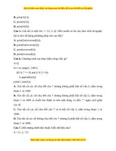 Câu 9. Danh sách A sẽ như thế nào sau các l nh s ệ au? >>> A = [2, 3, 5, 6] >>> A. append(4) >>> del (A[2]) A. 2, 3, 4, 5, 6, 4. B. 2, 3, 4, 5, 6. C. 2, 4, 5, 6. D. 2, 3, 6, 4. Câu 10. K t ế quả c a ch ủ ư ng t ơ rình sau là gì? A = [2, 3, 5, "python", 6] A.append(4) A.append(2) A.append("x") del(A[2]) print(len(A)) A. 5. B. 6. M i
