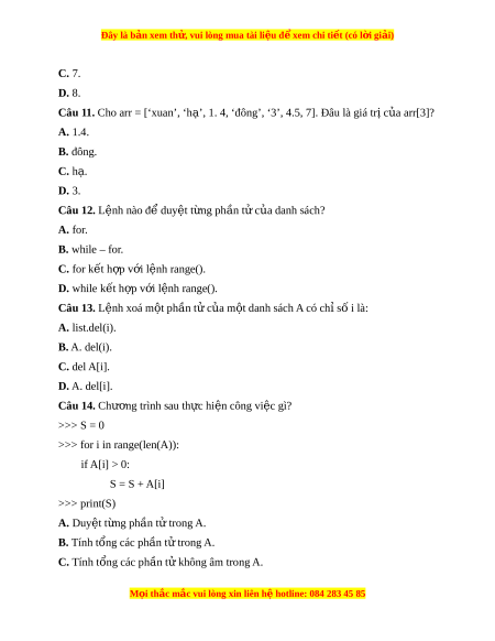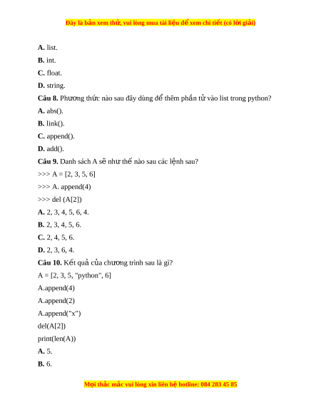 Đây là bản xem th , vu ử i lòng mua tài li u ệ đ xe ể m chi ti t (c ế ó l i ờ gi i ả ) A. list. B. int. C. float. D. string. Câu 8. Phư ng ơ th c ứ nào sau đây dùng đ t ể hêm ph n t ầ vào l ử ist trong python? A. abs(). B. link(). C. append(). D. add().