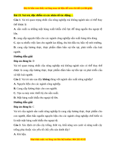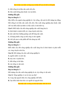 ố cây trồng, quy mô và c c ơ u cây t ấ r ng. ồ Câu 6. Đặc đi m ể quan tr ng nh ọ ất đ phân bi ể t ệ nông nghi p v ệ i ớ công nghi p l ệ à A. ng d ứ ng ụ thành t u c ự a khoa h ủ c ọ công ngh vào s ệ n xu ả t ấ . B. đ t ấ trồng là t l ư i u s ệ n xu ả t ấ ch y ủ u ế và không th t ể hay th . ế C. s n xu ả ất nông nghiệp ph t ụ hu c vào đi ộ u ki ề ện t nhi ự ên. D. s n xu ả ất có tính mùa v , có s ụ phân b ự ố tư ng đ ơ i ố r ng. ộ Hư ng d ớ ẫn gi i ả Đáp án đúng là: B Đặc đi m ể quan tr ng ọ nh t ấ để phân bi t ệ nông nghi p ệ v i ớ công nghi p ệ là đ t ấ trồng là t l ư i u s ệ n xu ả t ấ ch y ủ u và ế không th t ể hay th . ế Câu 7. S n ả xu t ấ nông nghi p có t ệ ính b p bênh và ấ không n đ ổ ịnh chủ y u do ế A. chịu nh ả hư ng c ở a ủ nguồn nư c, ớ đ t ấ đai. B. tính b t ấ bênh không ổn đ nh c ị a khí ủ h u. ậ C. chịu tác đ ng ộ tr c ự ti p ế c a con ng ủ ư i ờ . D. s n xu ả ất ph t ụ hu c nhi ộ u ề vào th t ị rư ng. ờ Hư ng d ớ ẫn gi i ả Đáp án đúng là: B S n ả xu t ấ nông nghi p ệ phụ thu c ộ vào đi u ề ki n ệ t ự nhiên (đ t ấ , khí h u, ậ đ a ị hình, …). Do v y ậ các thiên tai (bão, h n ạ hán, lũ l t ụ …) và hi n ệ tư ng ợ th i ờ ti t ế kh c ắ nghiệt (giá rét, sư ng ơ mu i ố , băng tuy t ế ) s ẽ có tác đ ng ộ tr c ự ti p ế đ n ế ho t ạ đ ng ộ s n ả xu t ấ nông nghi p.