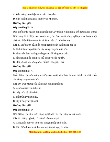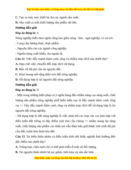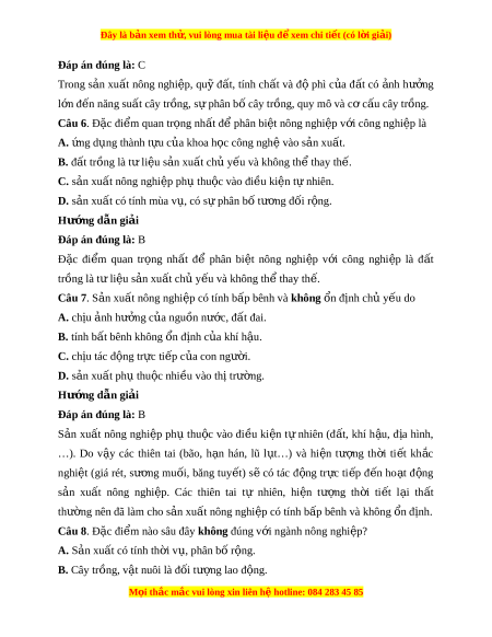 Đây là bản xem th , vu ử i lòng mua tài li u ệ đ xe ể m chi ti t (c ế ó l i ờ gi i ả ) Đáp án đúng là: C Trong s n ả xu t ấ nông nghi p, ệ quỹ đ t ấ , tính ch t ấ và đ ộ phì c a ủ đ t ấ có nh ả hư ng ở l n đ ớ n